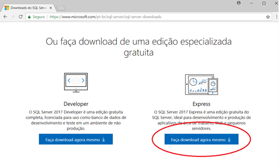 Para realizarmos a instalação do banco de dados utilizaremos o Sistema Operacional Windows 10, 64 bits. Entre no site abaixo na seção de downloads localizando a opção “Express” e para baixá-lo clique no botão “Faça download agora mesmo”.