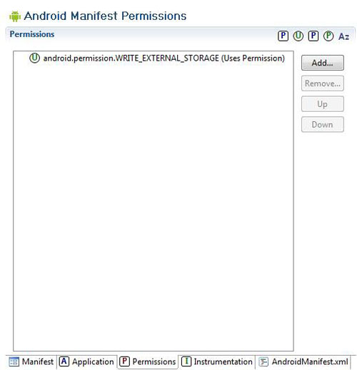 Um detalhe importante para esse projeto é que será necessário habilitar a permissão “WRITE_EXTERNAL_STORAGE” no arquivo manifest, pois graças a essa permissão que seu aplicativo pode gravar arquivos no SD Card. Dê um duplo clique no arquivo “AndroidManifest.xml” e na aba “Permissions” clique no botão “Add” para adicionar o código a seguir. Ver Imagem 01.