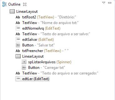 O lay-out da aplicação se dividirá em duas partes, a primeira iremos criar um arquivo do tipo texto e salvá-lo no cartão SD, já a segunda escolheremos o arquivo para posteriormente carregá-lo em um EditText.